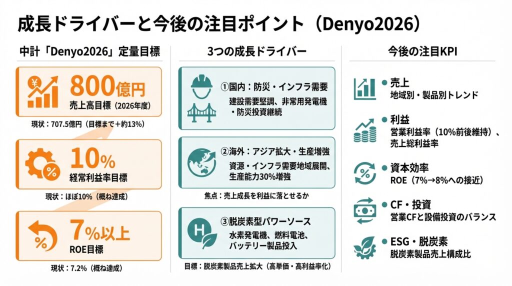 - 中期経営計画「Denyo2026」では、売上800億円・ROE7%以上・経常利益率10%を掲げ、国内防災・インフラ需要と海外・脱炭素製品を成長エンジンと位置づけている。