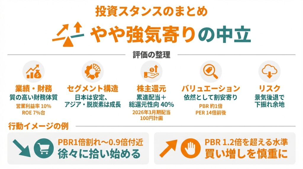 ここまでの定量・定性分析を前提に、「中長期(3〜5年)でのスタンス」をあえて言語化すると、