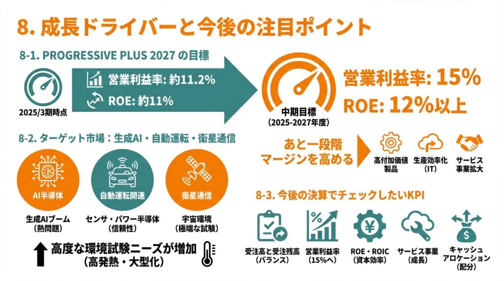 今後は生成AI・AI半導体・自動運転・衛星通信など先端技術分野の信頼性試験が新たな成長ドライバーになるというのが会社の基本シナリオ。 - ネットキャッシュ・自己資本比率75%前後と財務は極めて健全で、