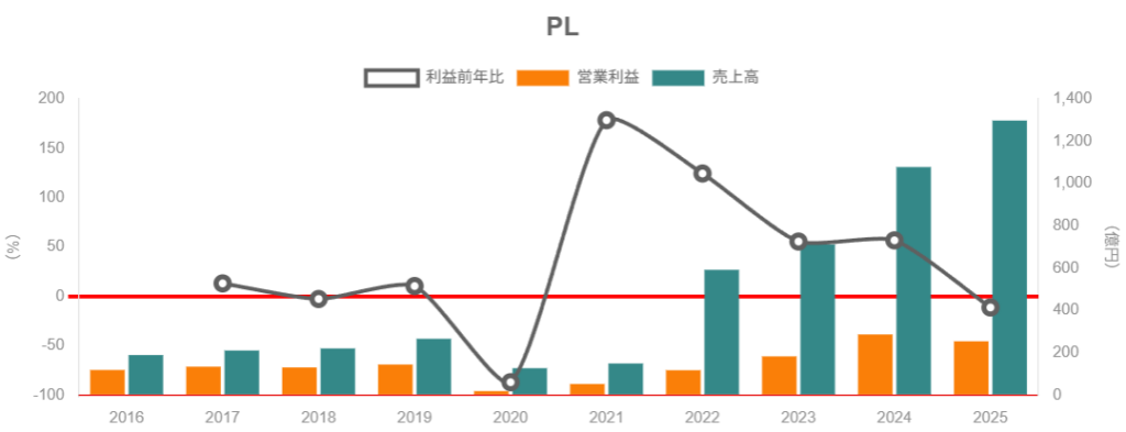 - 2021〜2024年にかけて売上・利益ともに急拡大し、2025年も売上は過去最高を更新。