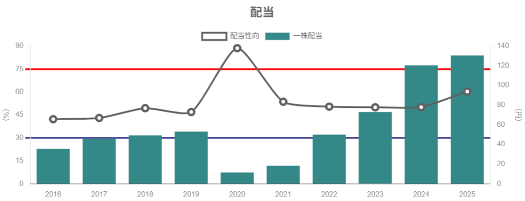 - 配当性向50%前後+高配当(利回り6%台)+自社株買い・消却を組み合わせた株主還元姿勢は明確。