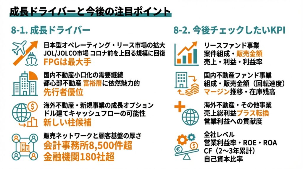 FPGは「JOL+不動産小口化」に集中した高収益モデルである一方、事業の多様性という意味では大手に比べてリスク分散度は低い、というのが中立的な見方です。