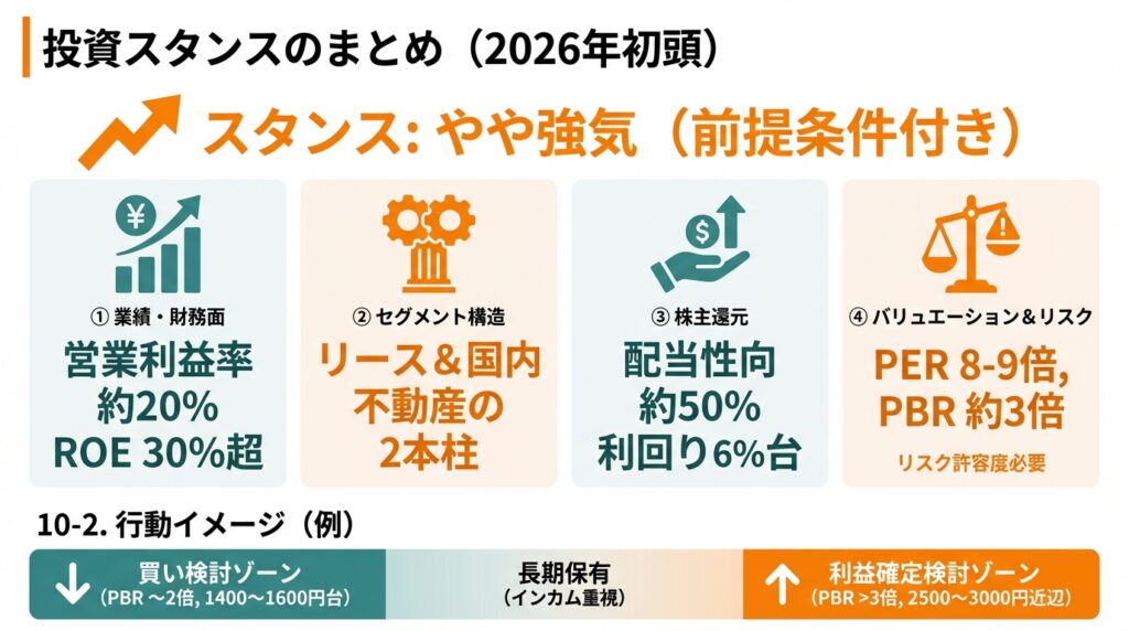 - PBR2倍前後(株価1,400〜1,600円台)に近づく局面があれば、事業環境に大きな変化がないか確認したうえで、中長期の買い増し検討ゾーンとして見る、というような発想もあり得ます。