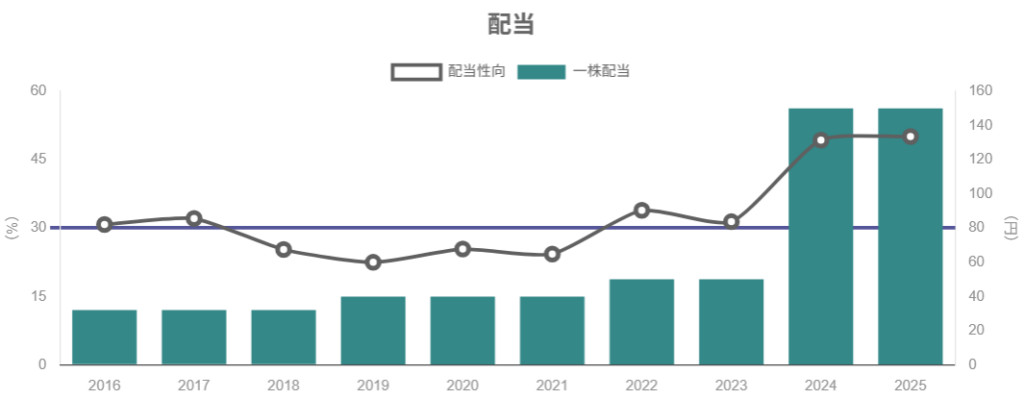 - 一株配当は2022年50円→2024年150円と大きく増加し、その後も高水準を維持。
