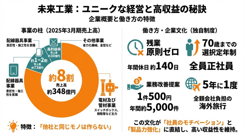 未来工業は1965年創業の電設資材・管工機材メーカーで、電気工事で使う樹脂ボックスや配管部材などを主力としています。