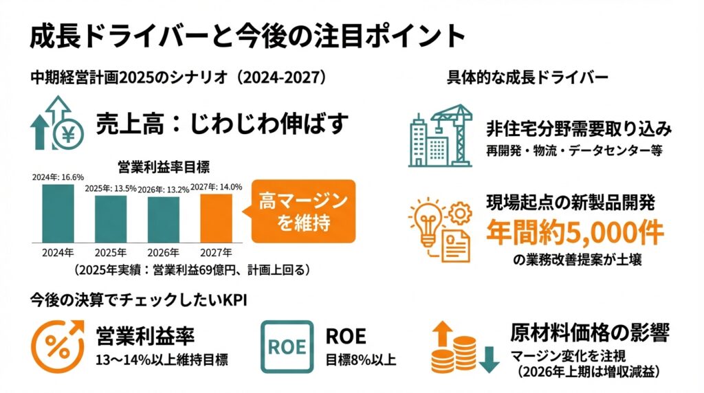 - 未来工業は、電設・管材ニッチでトップシェア製品を持ち、2024年以降は営業利益率15%前後・ROE9〜10%と、収益性が一段高くなった段階にある。