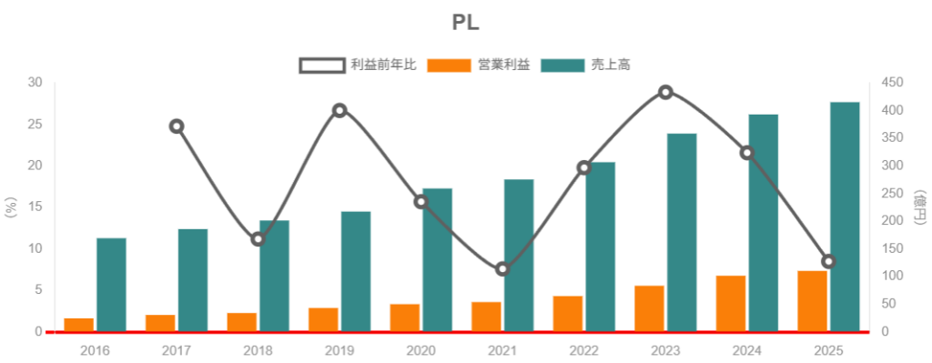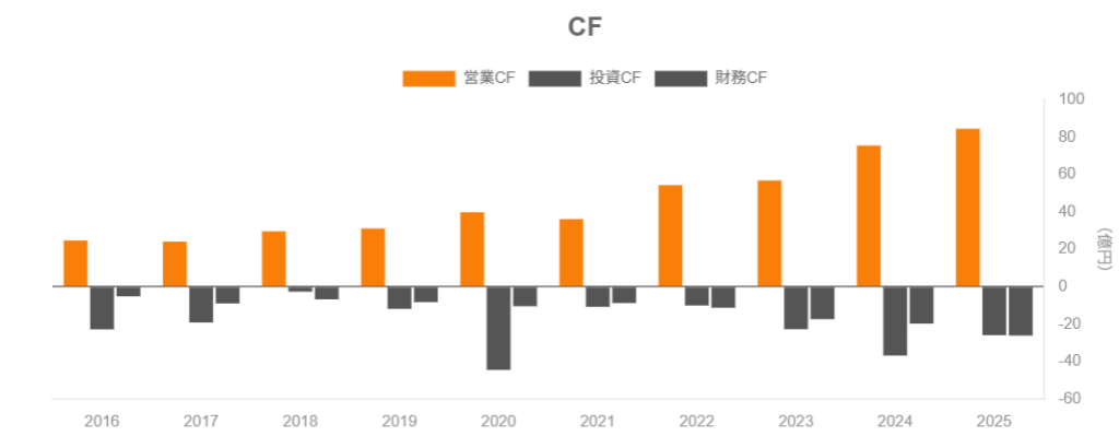 • 2021〜2025年で売上CAGR約11%、営業利益CAGR約20%と、売上以上に利益が伸びるレバレッジ型成長を達成している一方、財務は無借金・自己資本比率80%超と極めて保守的。