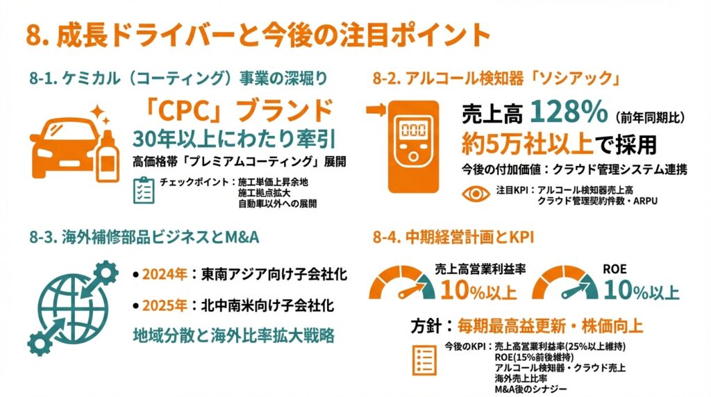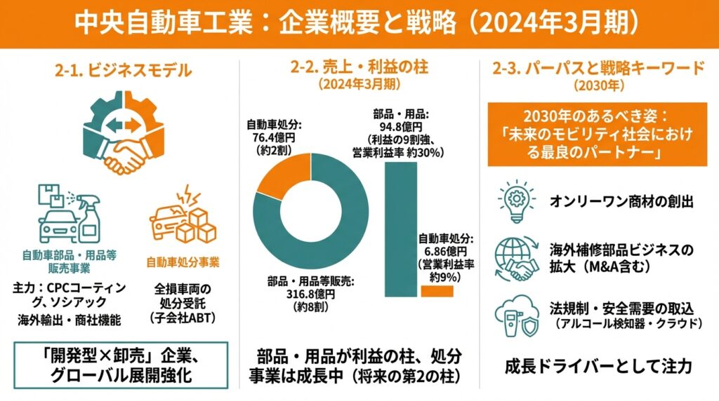 • 中央自動車工業は、高付加価値ケミカル・アルコール検知器+補修部品輸出+自動車処分を組み合わせた開発型企業で、営業利益率26%・ROE15%前後という高収益体質を持つ。