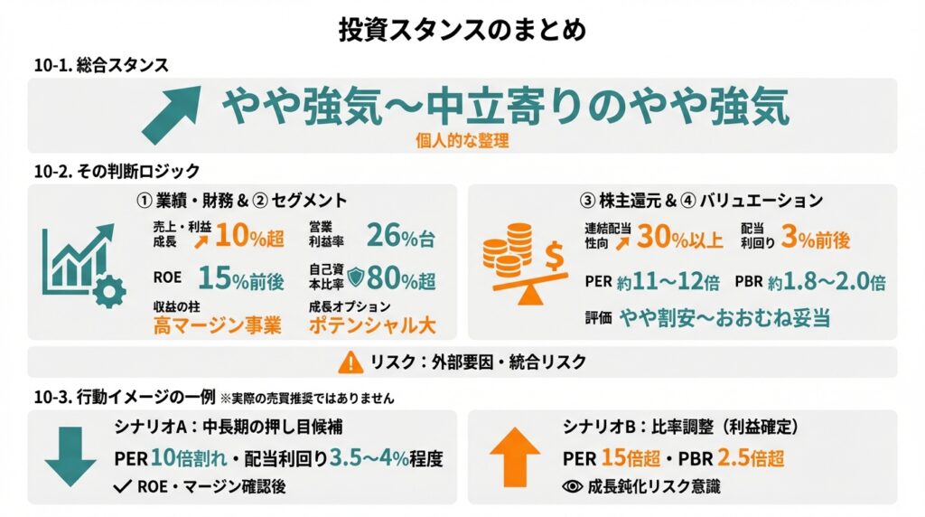 • 現在のバリュエーション(PER11〜12倍・PBR1.8〜2.0倍)は、同業・市場平均と比較してやや割安〜妥当ゾーンと解釈しうるが、今後のROE・マージン維持が前提条件となる。