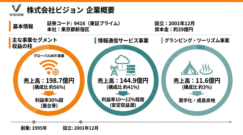 - ビジョンは、グローバルWiFi事業を核に、情報通信サービス・グランピング・ツーリズムを組み合わせた「旅行×通信×IT」の事業ポートフォリオを持つ成長企業。