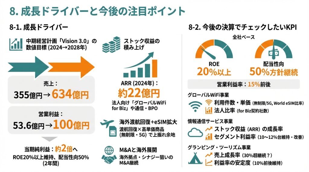 - ただし、グローバルWiFi事業とのシナジー(訪日客の獲得・販促チャネルの共有)が大きく、中長期での成長オプションとして位置づけられます。