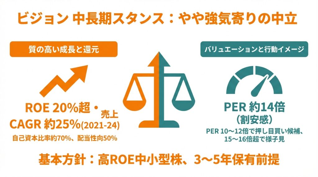 - 「高ROEの中小型株に中長期で乗る」イメージで、3〜5年の保有前提。