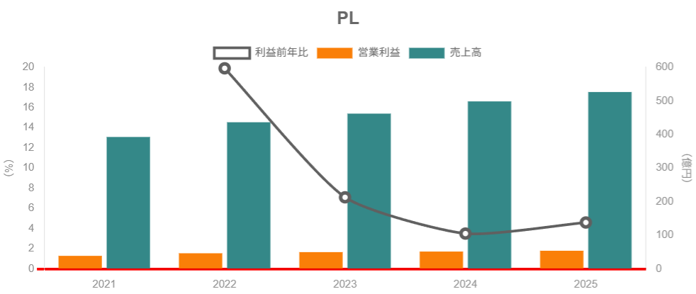 - 売上は2020〜2025年で年率約+6%、営業利益率は一貫して10%前後を維持