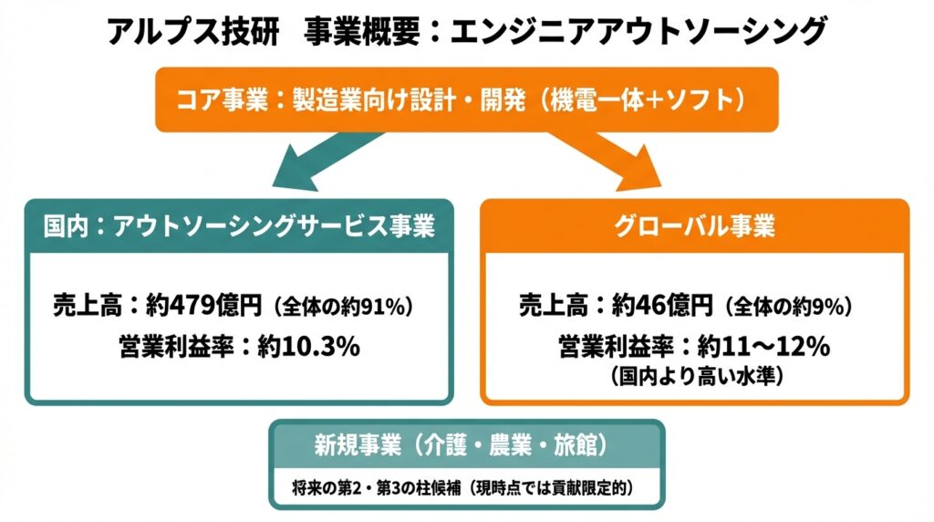 グローバル事業は、海外のプラント設備や機械装置の設計・製作・据付、メンテナンス、人材サービスなどを提供しており、売上比率こそ1割弱ですが、利益率は国内事業より高い水準です。