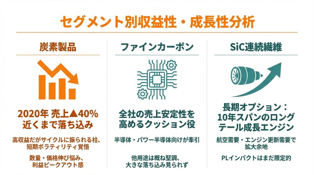 - 黒鉛電極・ファインカーボン・SiC連続繊維という事業ポートフォリオの構造