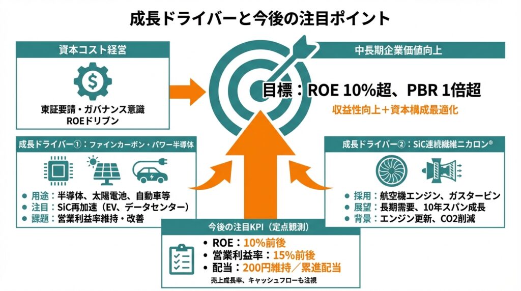 ファインカーボン・SiCで成長の芽を育てている。 - 半導体・航空機という「長期成長テーマ」に直結する素材を持っている点は魅力。