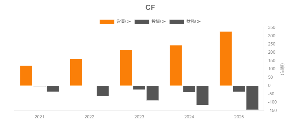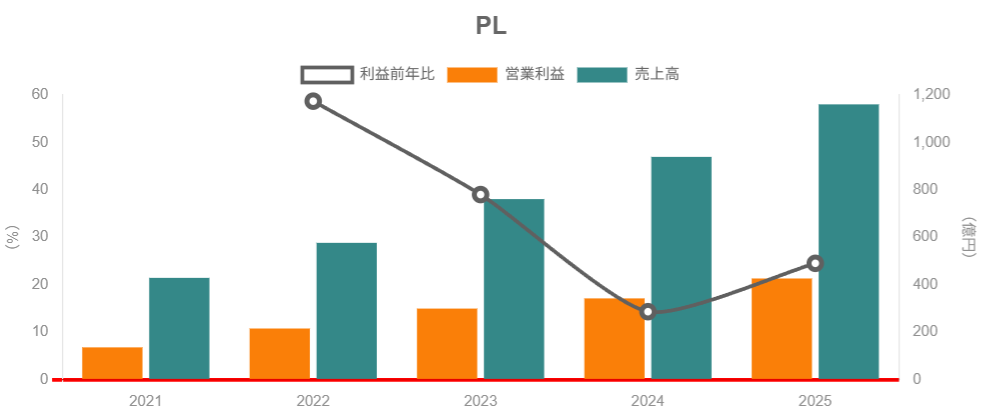 2020→2025年の売上高CAGRは約28〜29%営業利益CAGRは約43%と、売上以上に利益が伸びていることがわかります。