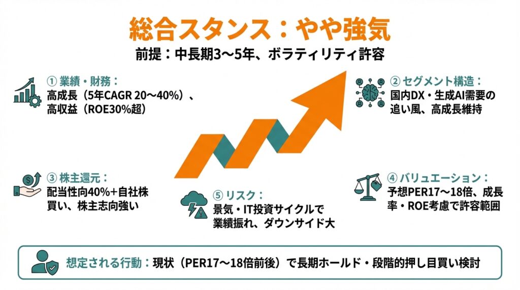 5. 一方で、景気・IT投資サイクル、人材獲得競争、高マージンの持続可能性、ガバナンス変化といったリスクがあり、株価ボラティリティも大きいため、「高リスク・高リターンの成長株」として位置づけるのが現実的である。