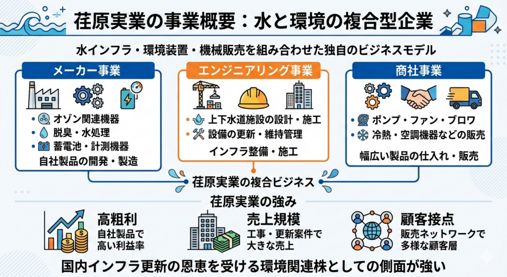 荏原実業は、水インフラ・環境装置・機械販売を組み合わせた“複合型”の会社です。単なる機械メーカーでも、単なる工事会社でもありません。自社製品を持ちつつ、上下水道施設などの設計・施工も行い、さらにポンプや送風機などの販売も手がけています。