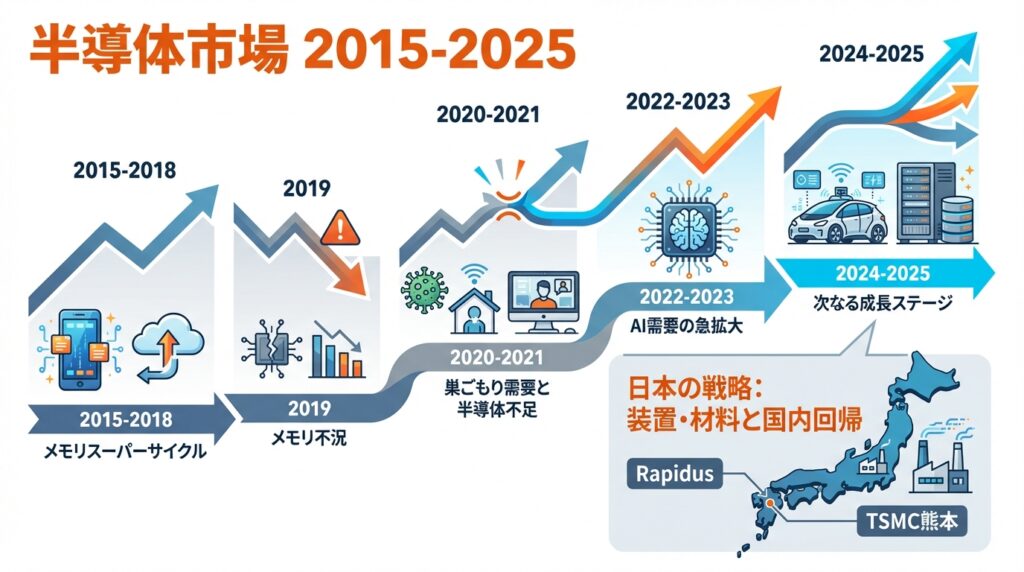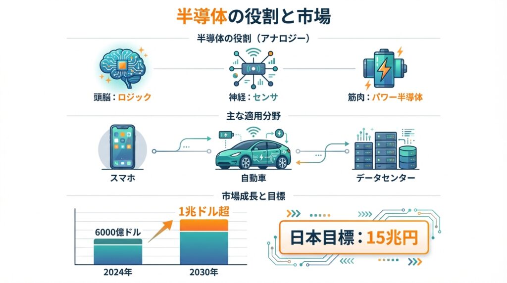 これら一つひとつが、市場では「どの分野の半導体が伸びるか」という形で投資テーマになります。
