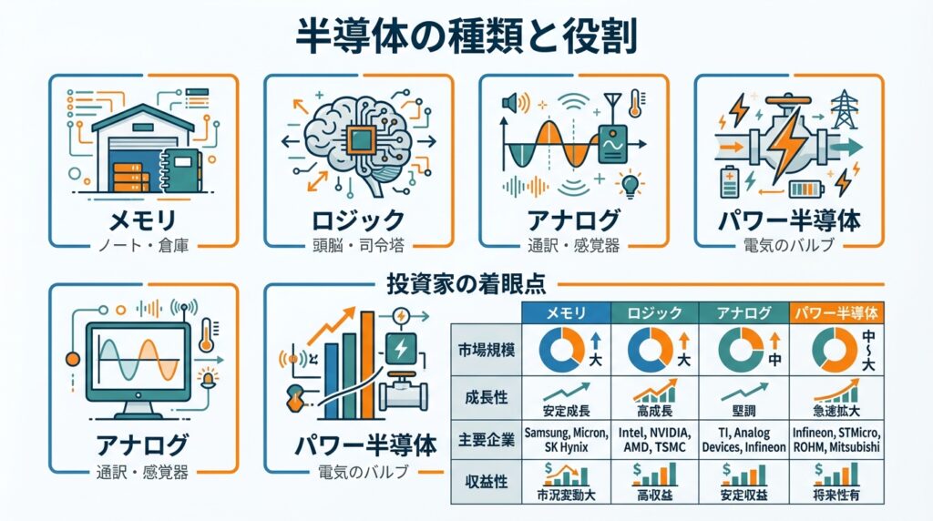 • ロジック=頭脳、メモリ=ノート、アナログ=通訳、パワー=電気のバルブ、と役割で捉えると理解が進む。