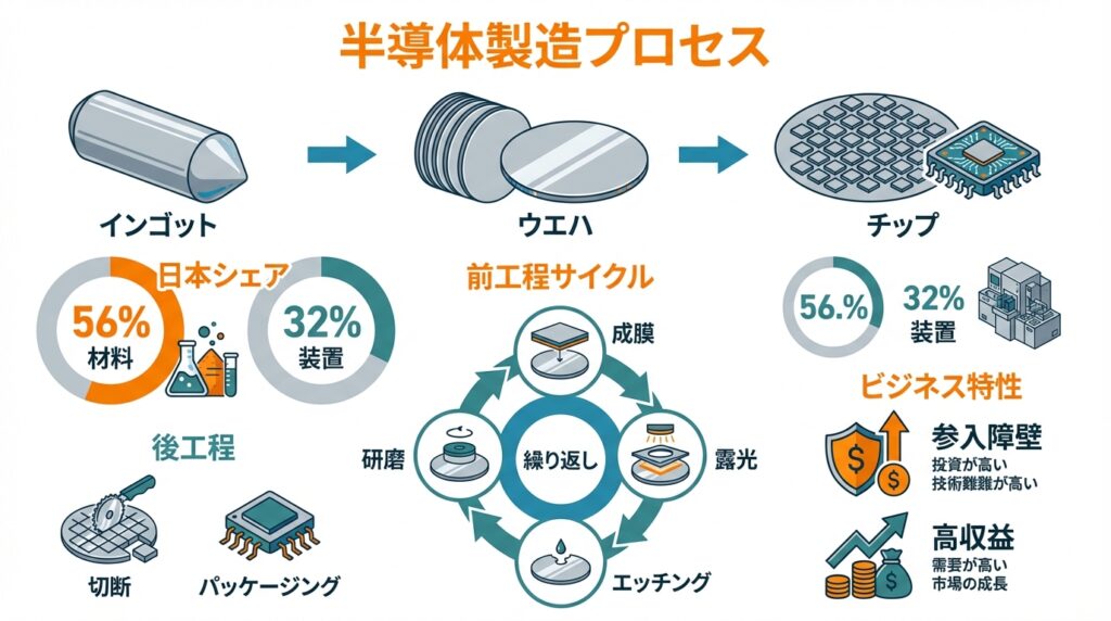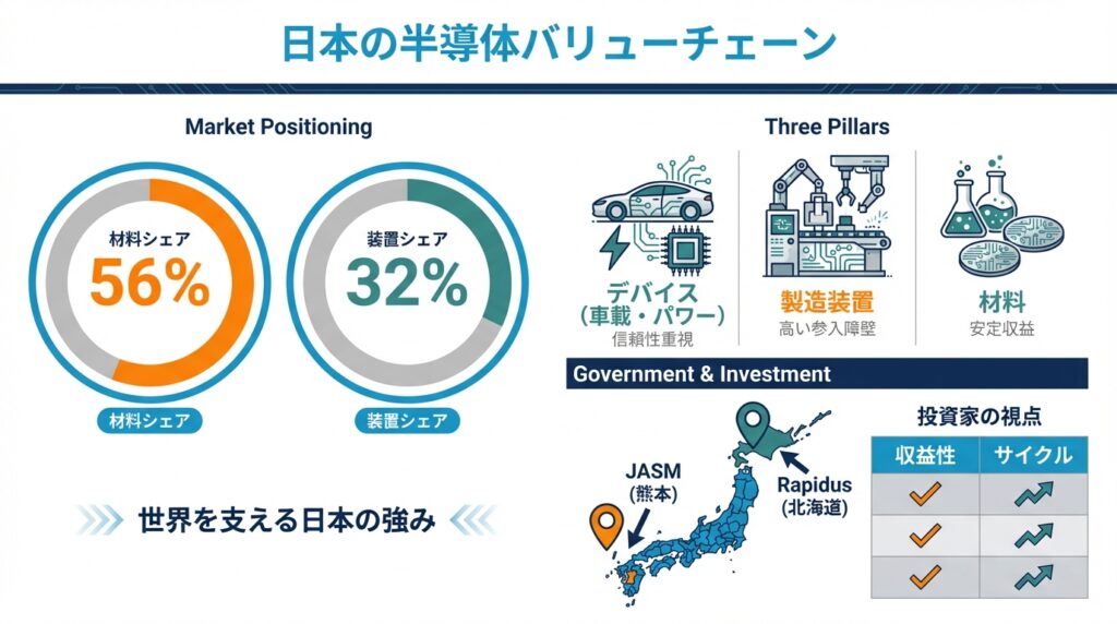 • 世界の材料シェア約56%、装置シェア約32%と、日本は裏方でかなりの存在感。