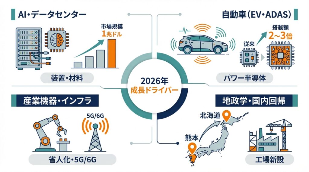 • 2026〜2030年の成長エンジンは「AIデータセンター+自動車+産業」